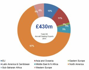 3. North America is the UK’s largest export market for aircraft seating – £288m worth of aircraft seating were exported to North America in 2015. However, the Asia and Oceania region was the fastest growing market, with a £10m, 30% increase from 2014 levels.
