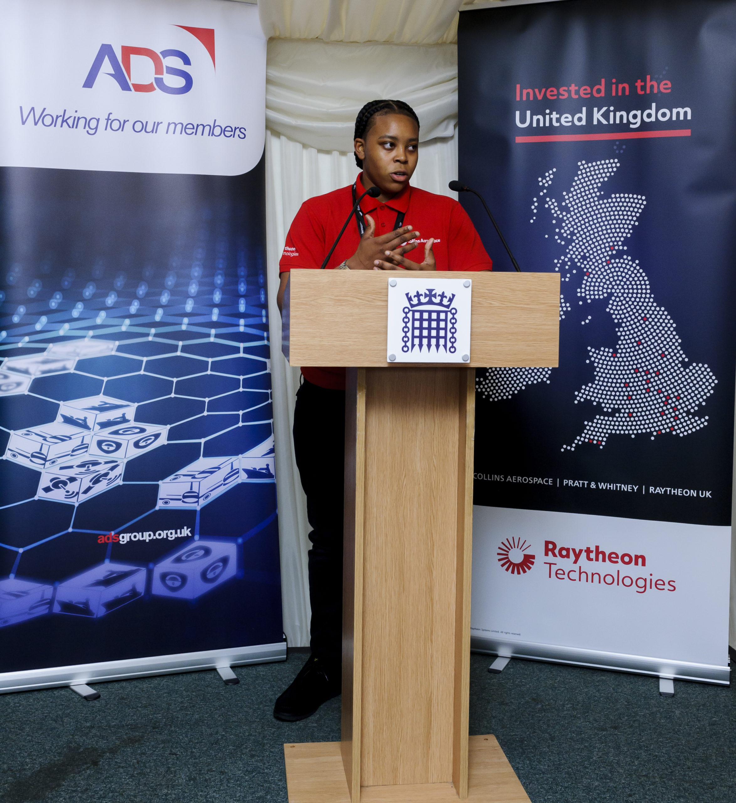 Apprentices Tianna Smalling (pictured) from Collins Aerospace and Adele Hughes from Raytheon UK each gave speeches outlining the value of apprenticeships in the ADS sectors. Their inspiring speeches are testament to the fact that ADS member companies are providing high-value, high-wage development, training and skills to the next generation of workers.