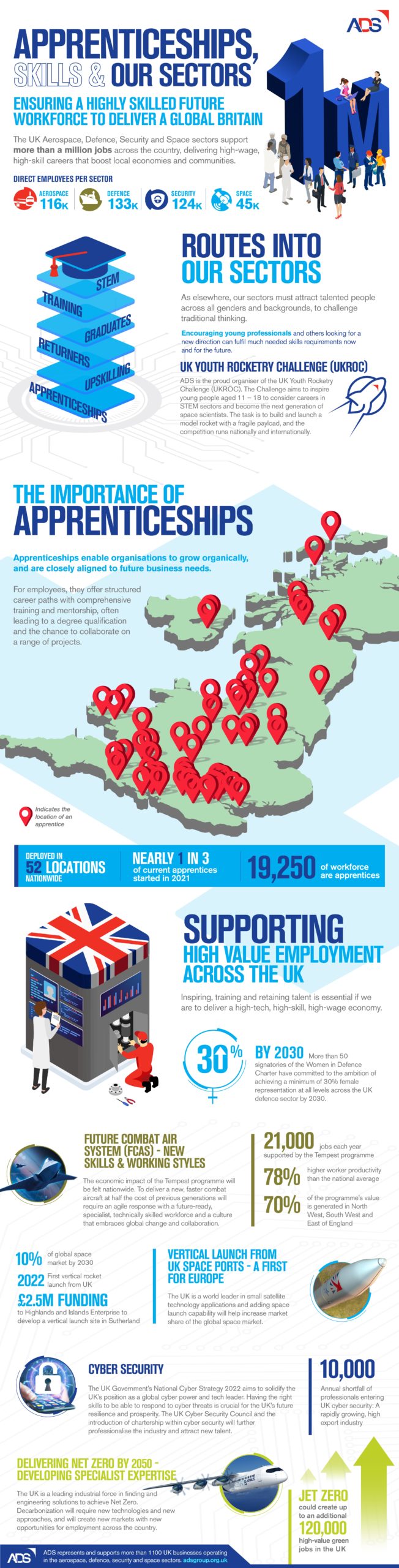 The UK aerospace, defence, security and space sectors support over 1m jobs across the country, providing high-wage and high skilled careers that boost local economies and communities. Direct jobs account for 116k employees in aerospace, 133k employees in defence, 124k employees in security and 45k employees in the space sector.