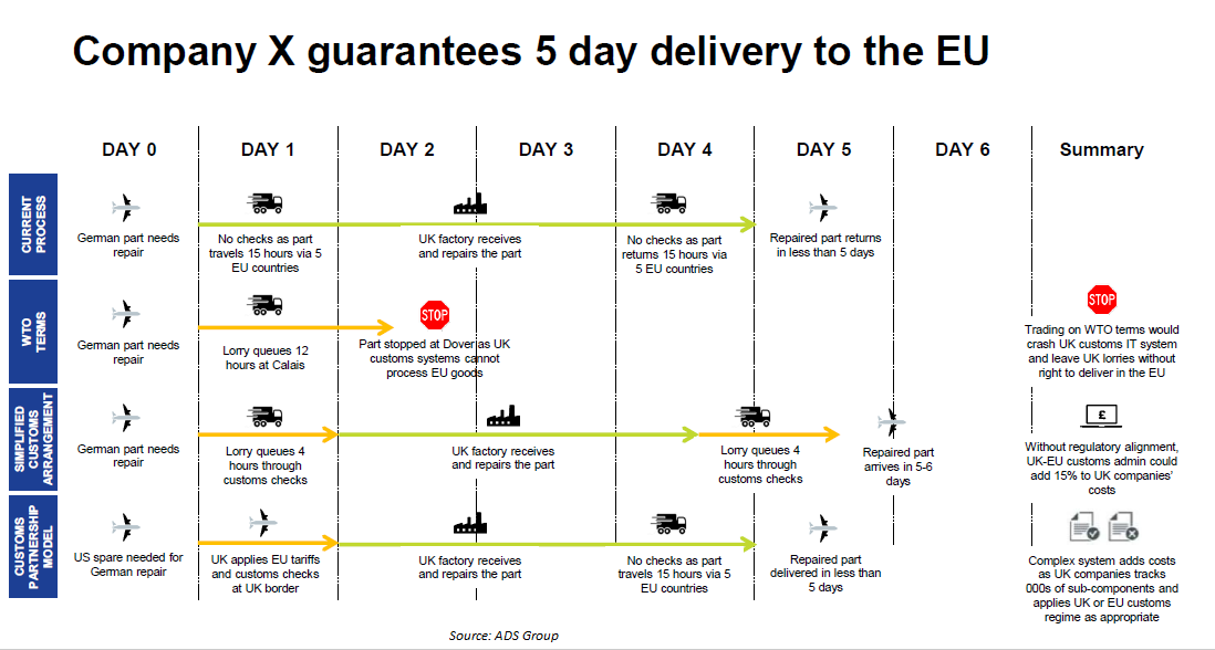 The below case study image depicts the differences between current customs process compared to other potential scenarios post-Brexit.