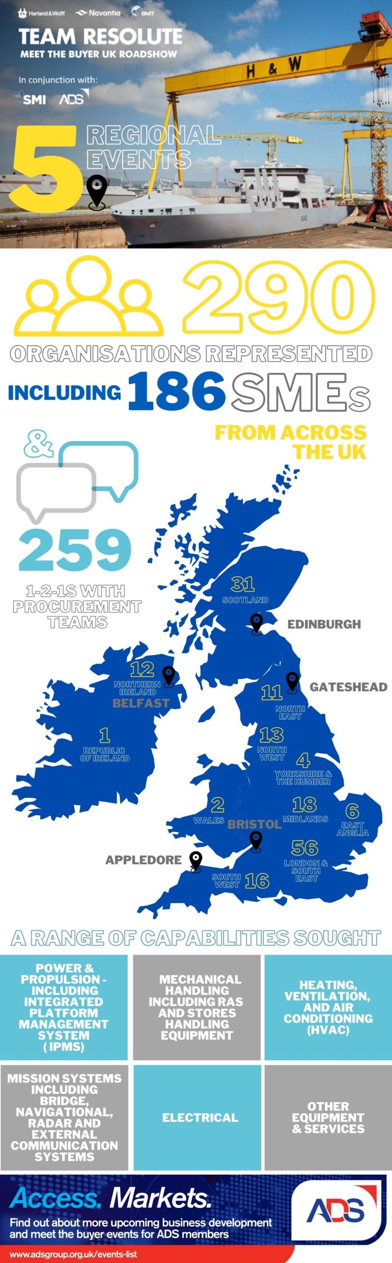 Quarter one of this year saw ADS team together with the Society of Maritime Industries (SMI) and Team Resolute, a UK consortium consisting of Harland & Wolff, Navantia and BMT, to offer members and organisations the chance to participate in a range of ‘meet the buyer’ events across the UK.