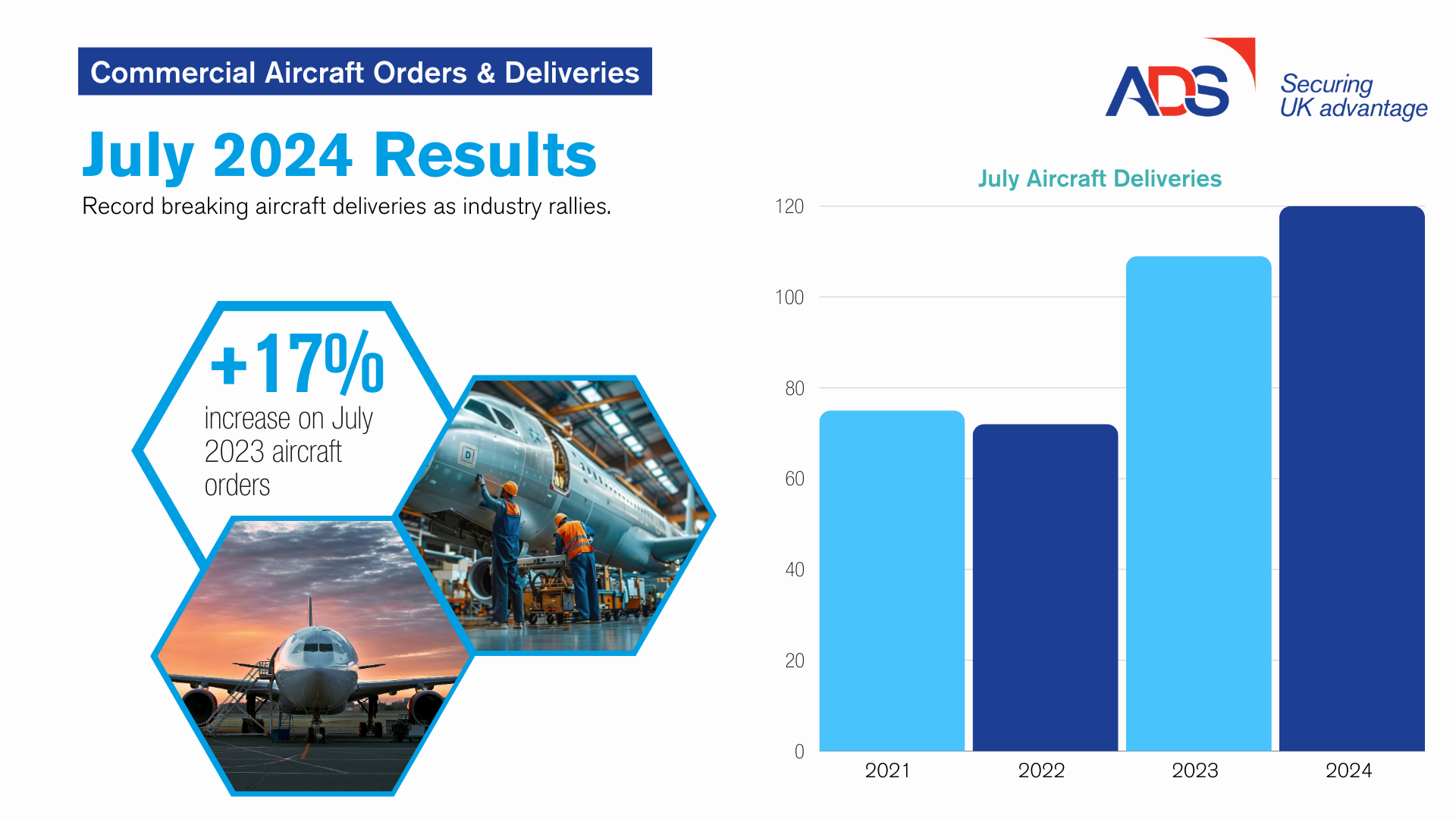 London (23 August 2024) – Aircraft deliveries in July 2024 represent the best month year to date, with 120 aircraft delivered by manufacturers. According to ADS, the trade association for the aerospace, defence, security and space sectors in the UK, this represents the best July for aircraft deliveries on record.
