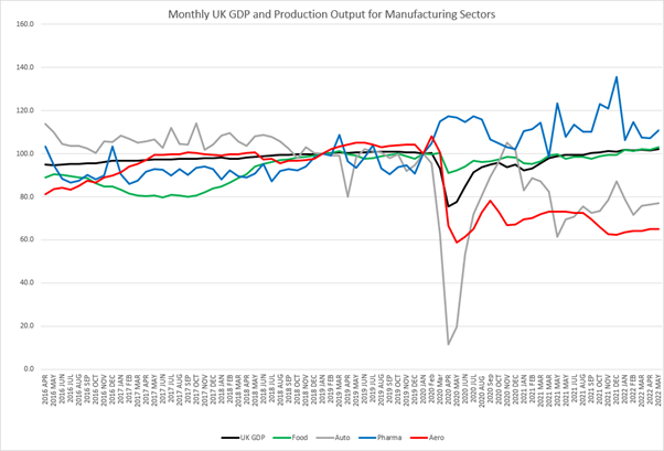 The chart shows the low and flat output for the aerospace manufacturing sector against the other high value manufacturing industries and UK GDP. Although the monthly growth in May is a positive step, we await more months of consistent growth in order to signal a real recovery starting. Expectations remain that flight recovery comes first, with orders and deliveries of aircraft to follow, once manufacturers ramp up rate, and supply chains can cope with the increase we should see this feed into the UK manufacturing output figures. If the current challenges facing the supply chain, this may be a little while off yet.