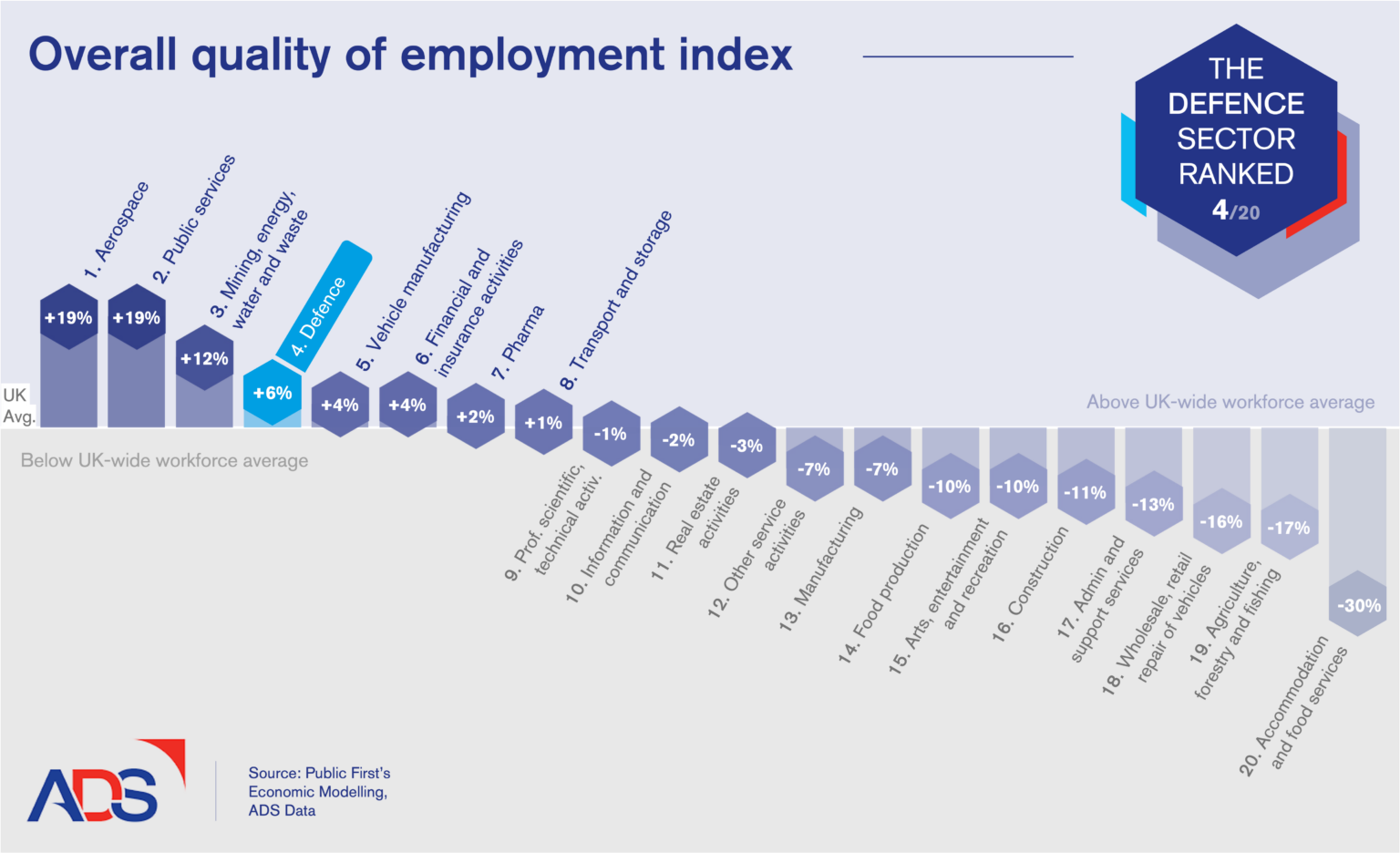 Scotland is uniquely positioned to become a global leader in defence and advanced manufacturing. The Index shows that job quality in the defence sector in Scotland is well above the average for private sector jobs with 81% 'high-quality' jobs.